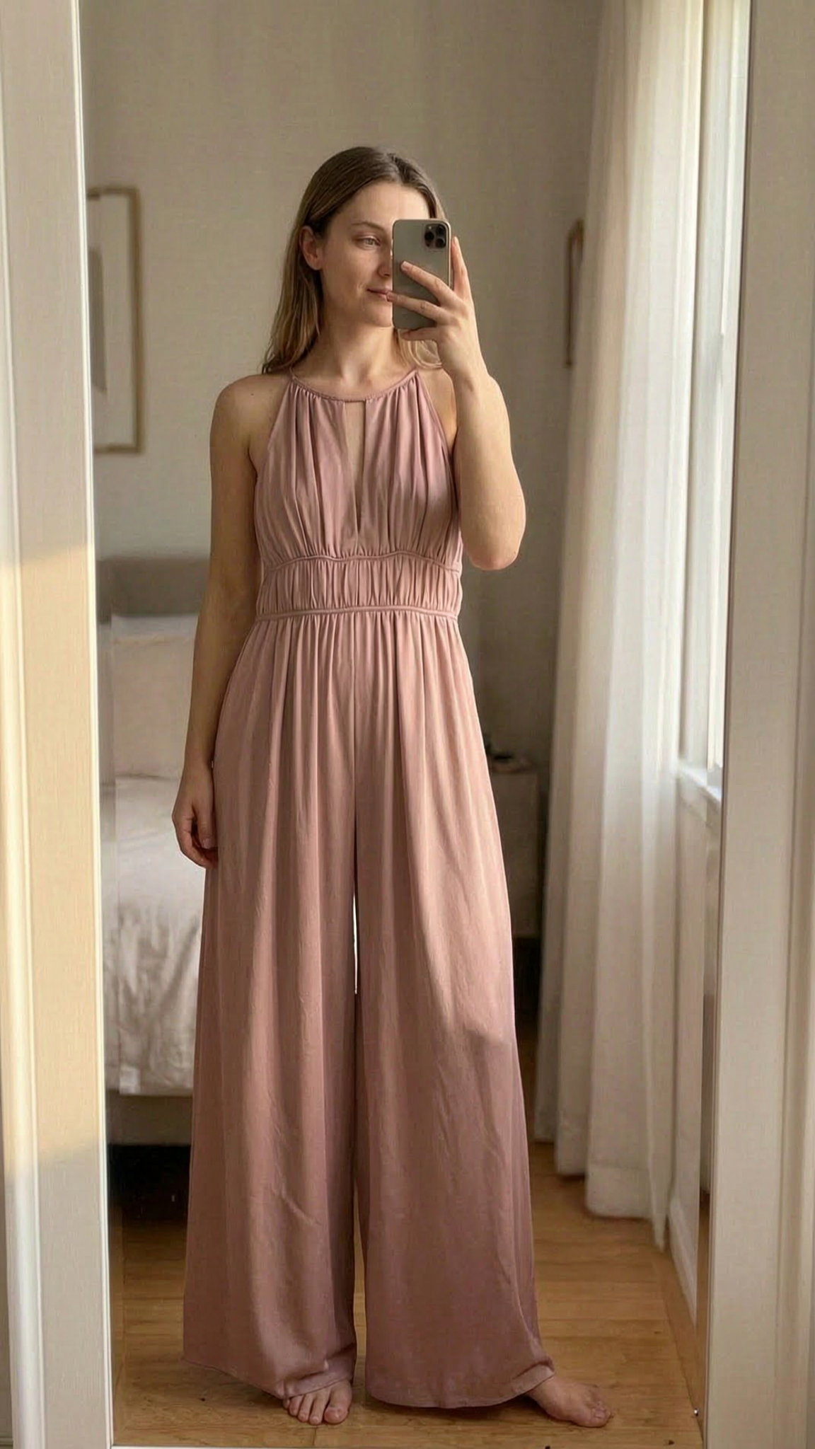 Combinaison longue Mango debout, face à la caméra, dans une chambre à la lumière douce, avec une lumière naturelle filtrant par la fenêtre.