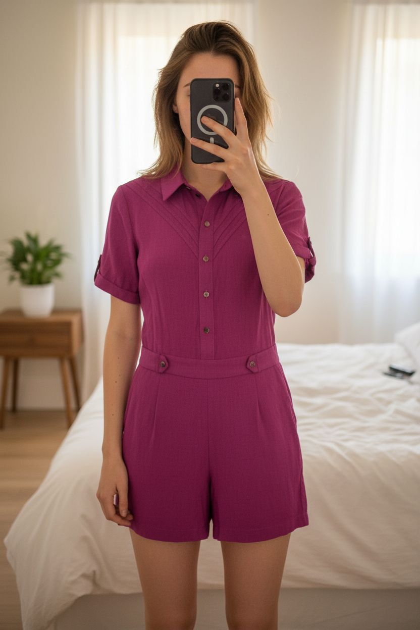 Combinaison Naf Naf 🌺 debout, face à la caméra, dans une chambre à la lumière douce, avec une lumière naturelle filtrant par la fenêtre.