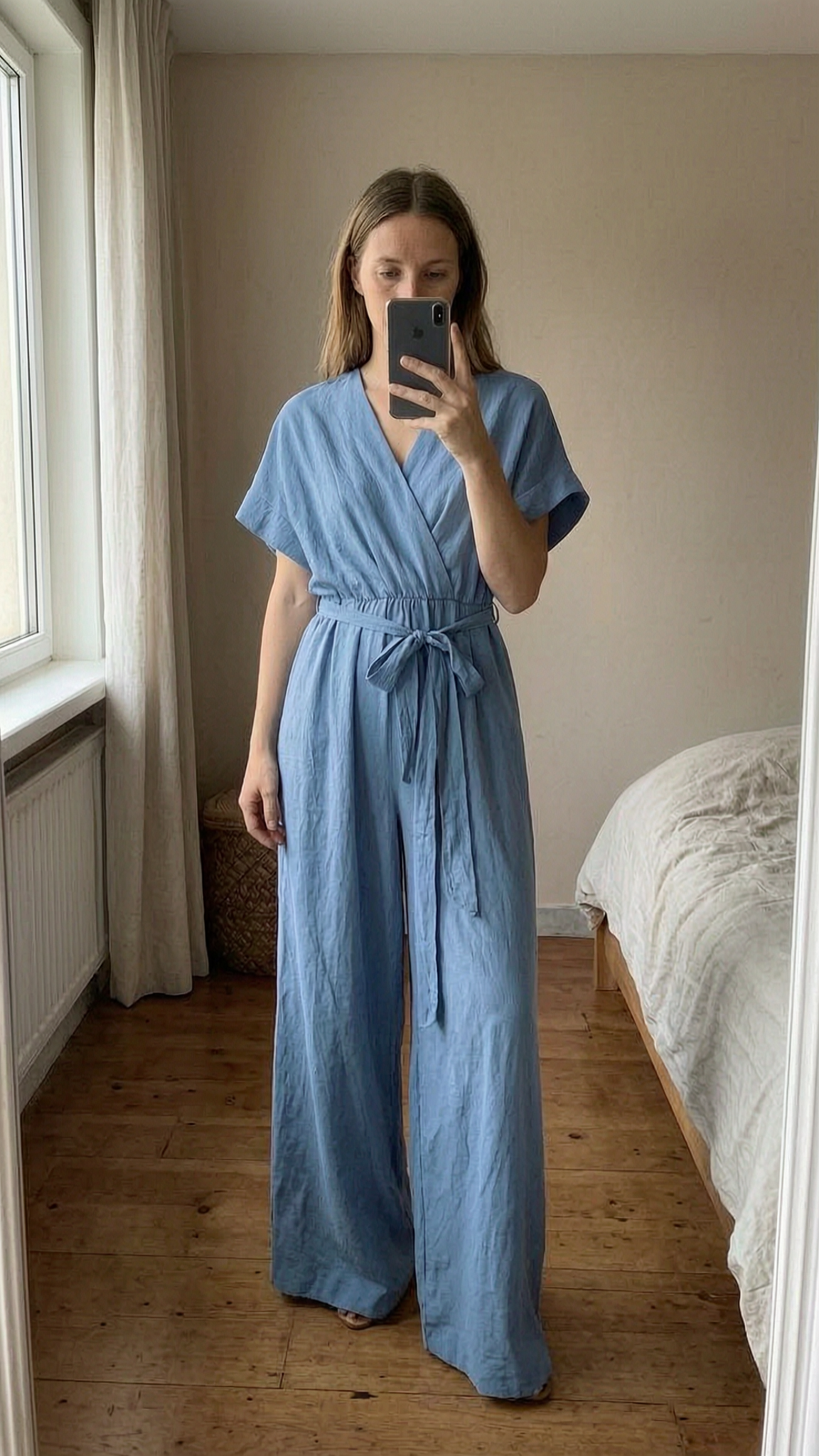 Combinaison pantalon fluide S debout, face à la caméra, dans une chambre à la lumière douce, avec une lumière naturelle filtrant par la fenêtre.