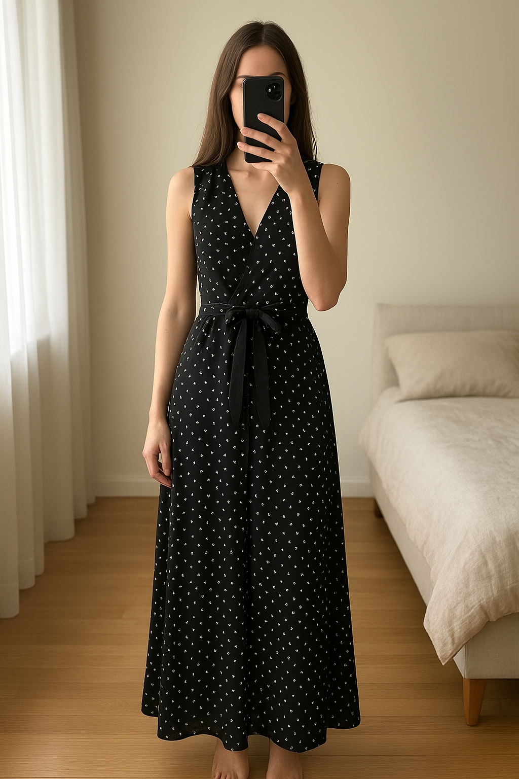 Combinaison à pois debout, face à la caméra, dans une chambre à la lumière douce, avec une lumière naturelle filtrant par la fenêtre.