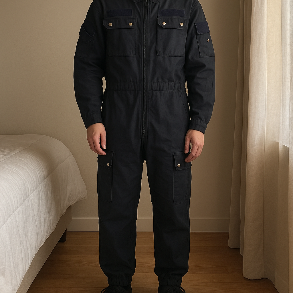 Combinaison psig debout, face à la caméra, dans une chambre à la lumière douce, avec une lumière naturelle filtrant par la fenêtre.