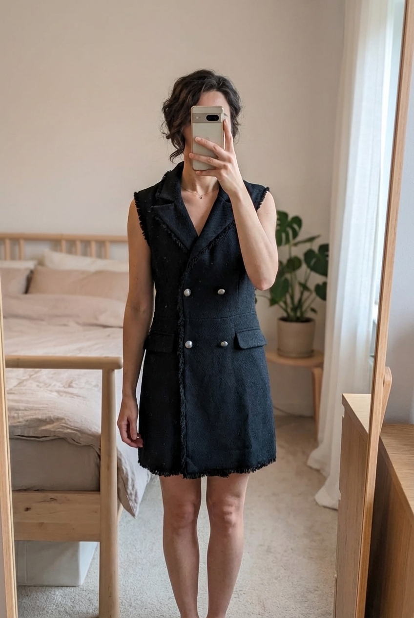 Combishort noire debout, face à la caméra, dans une chambre à la lumière douce, avec une lumière naturelle filtrant par la fenêtre.