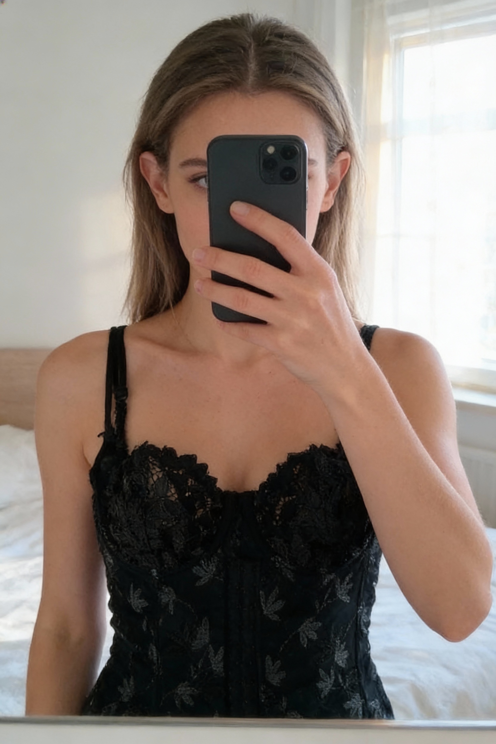 Corset Aubade Paris debout, face à la caméra, dans une chambre à la lumière douce, avec une lumière naturelle filtrant par la fenêtre.