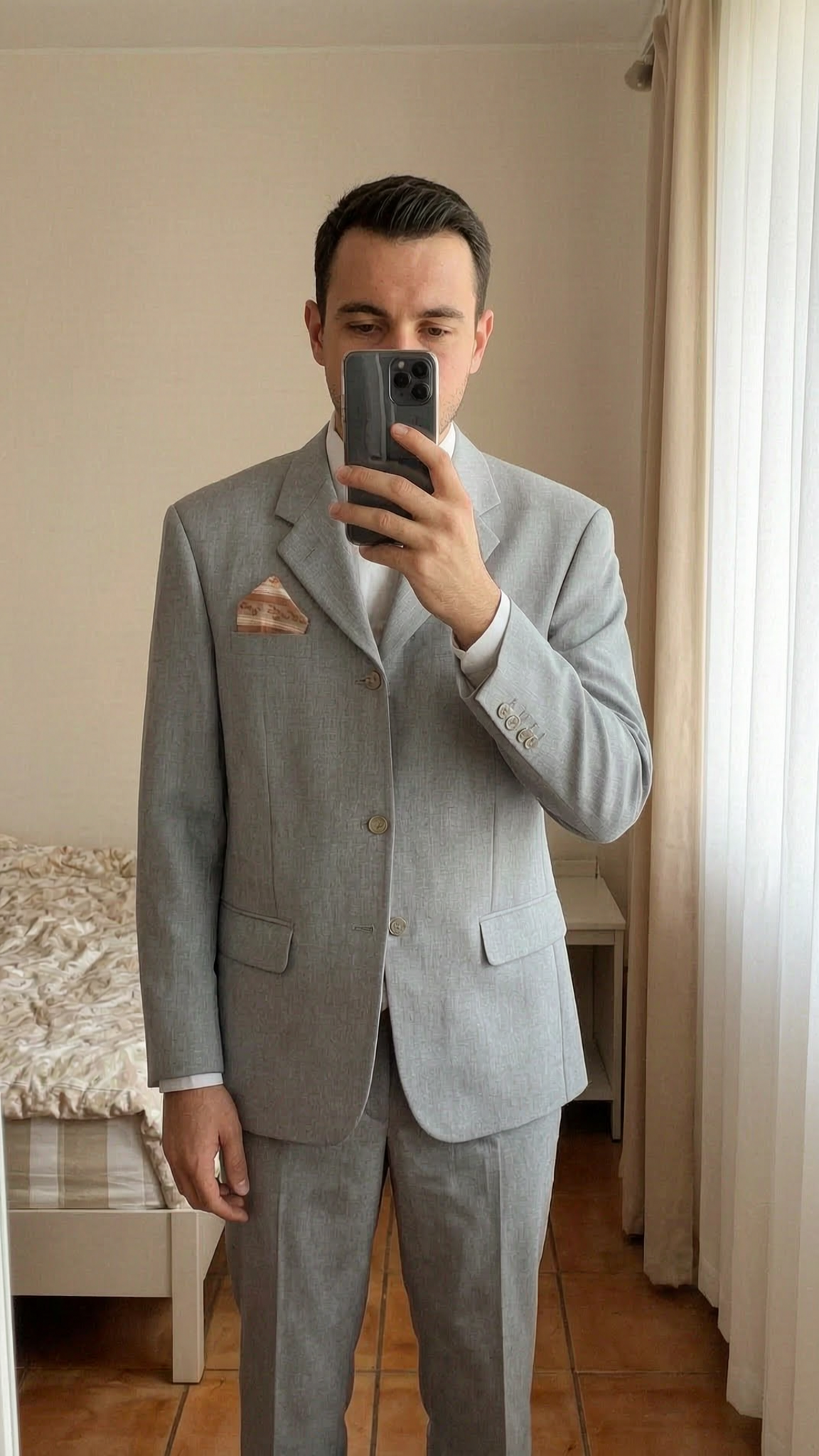 Costume complet debout, face à la caméra, dans une chambre à la lumière douce, avec une lumière naturelle filtrant par la fenêtre.