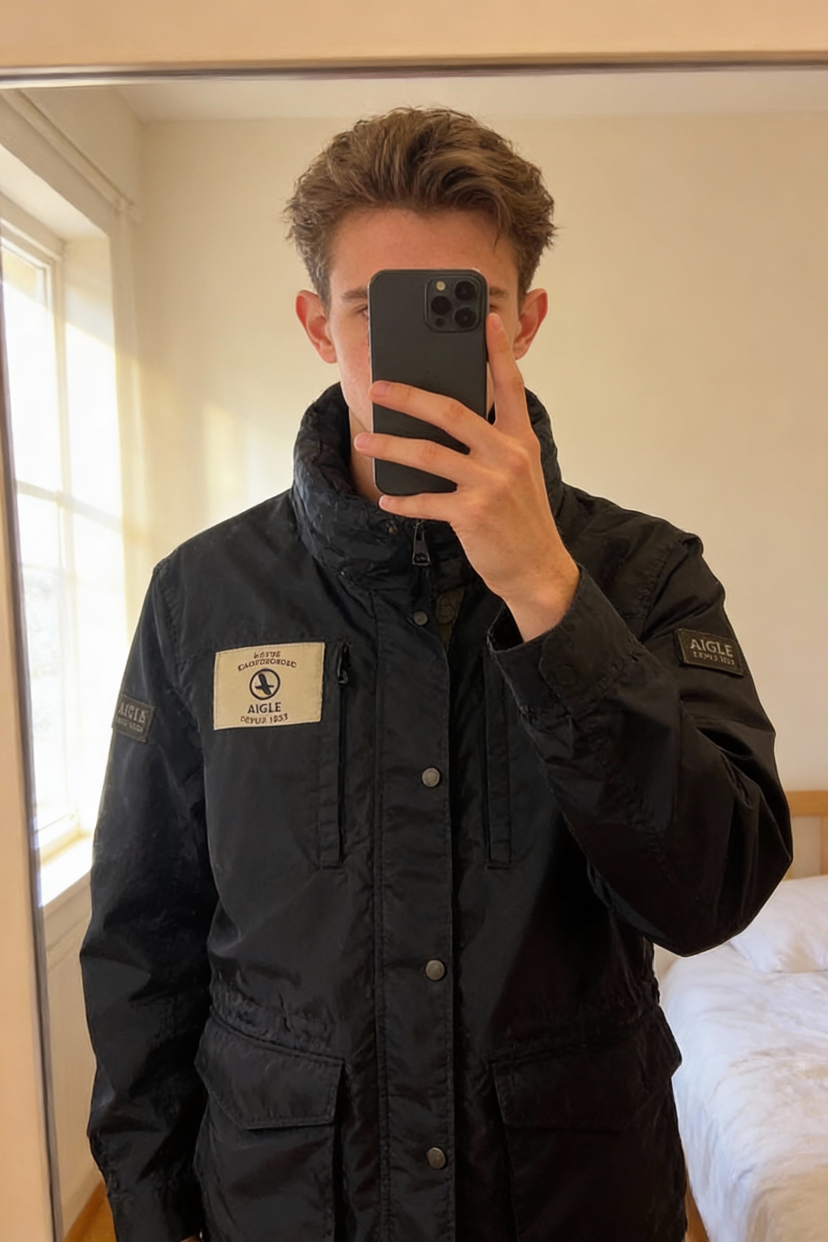 Coupe vent AIGLE debout, face à la caméra, dans une chambre à la lumière douce, avec une lumière naturelle filtrant par la fenêtre.