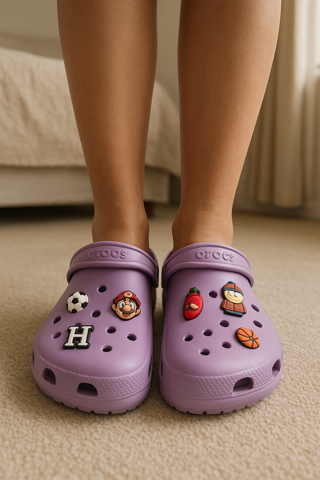 Crocs Baya violettes – Neuves jamais portées – Taille 45/46 debout, face à la caméra, dans une chambre à la lumière douce, avec une lumière naturelle filtrant par la fenêtre.