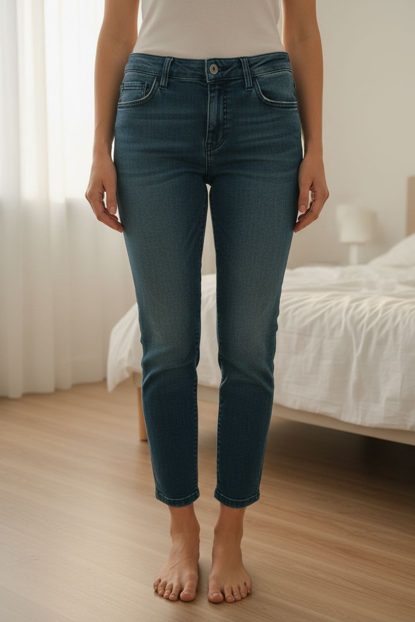Cropped jeans tomboy fit Marella debout, face à la caméra, dans une chambre à la lumière douce, avec une lumière naturelle filtrant par la fenêtre.