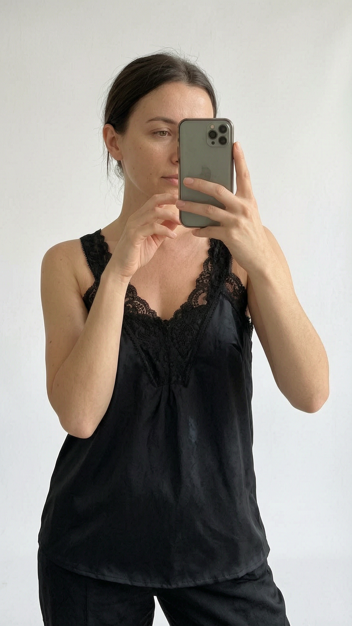 Une personne en Débardeur, haut, avec dentelle, Taille 40/42, Marque By Coco cambrant légèrement le dos pour une pose dynamique, dans un studio photo épuré avec fond blanc et éclairage doux.