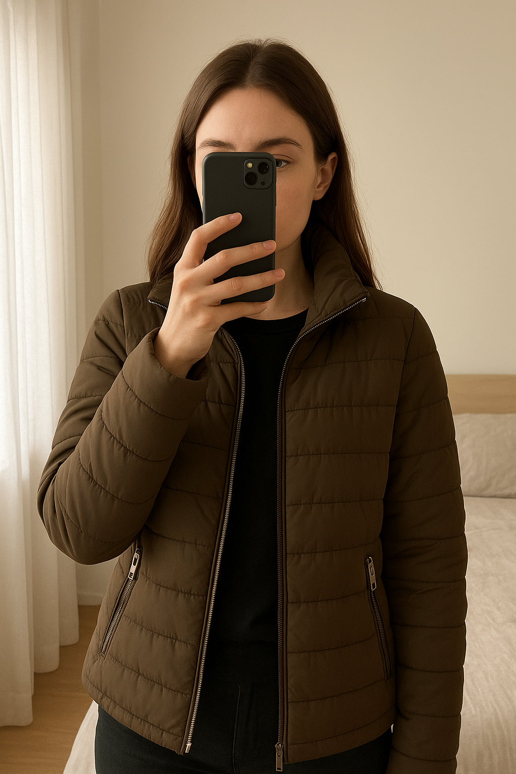 Doudoune debout, face à la caméra, dans une chambre à la lumière douce, avec une lumière naturelle filtrant par la fenêtre.