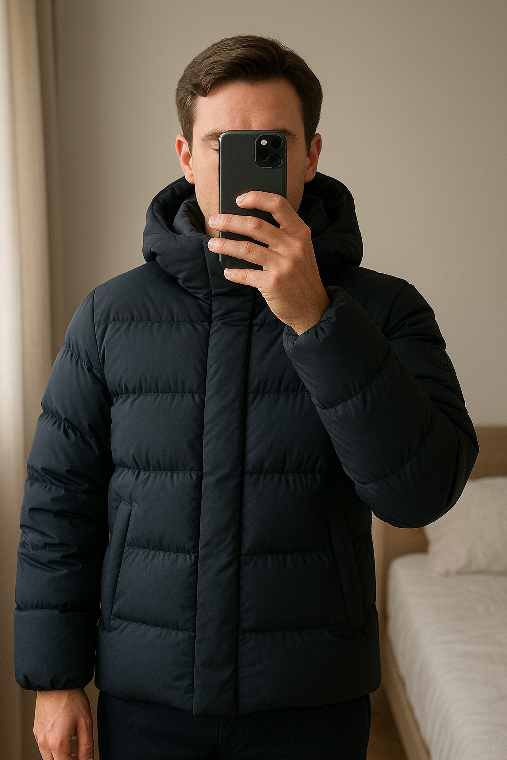 Doudoune Fusalp debout, face à la caméra, dans une chambre à la lumière douce, avec une lumière naturelle filtrant par la fenêtre.