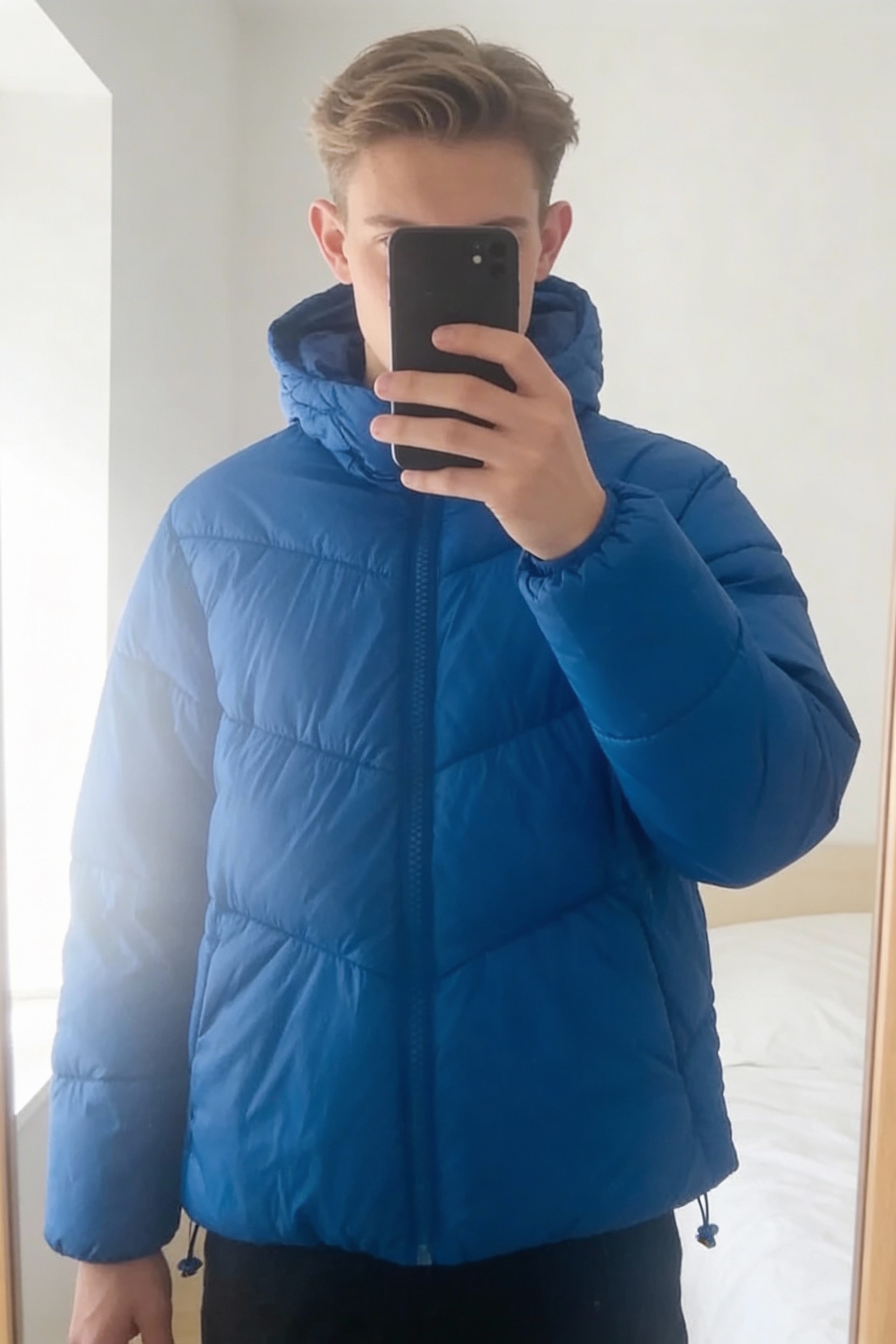 Doudoune H&M debout, face à la caméra, dans une chambre à la lumière douce, avec une lumière naturelle filtrant par la fenêtre.