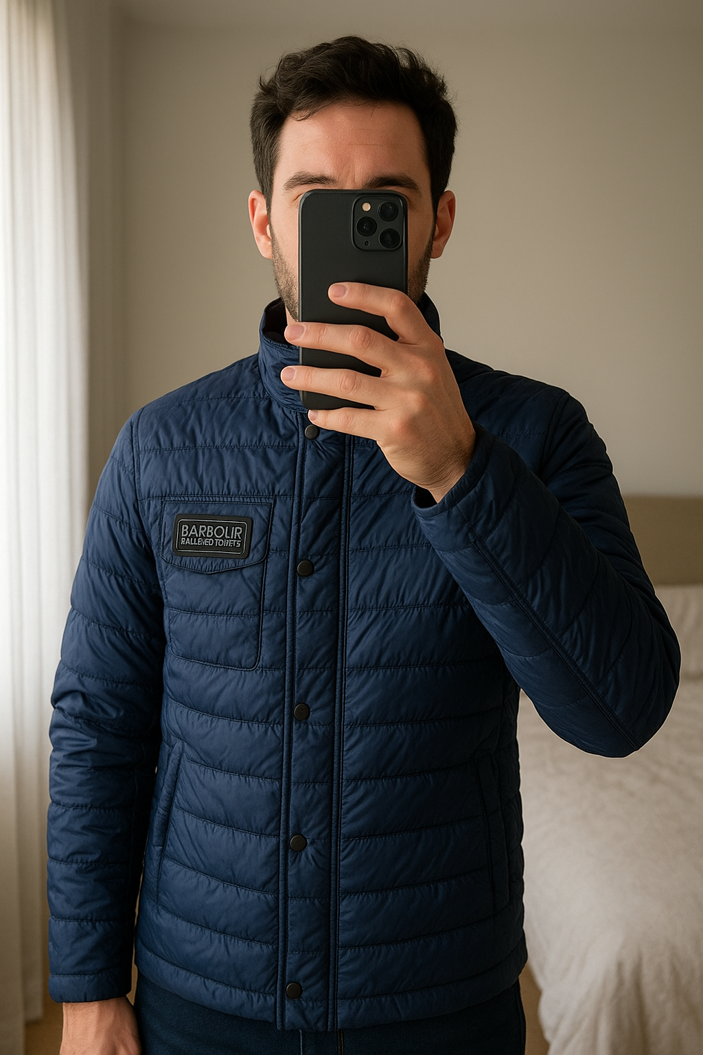 Doudoune homme Barbour taille M debout, face à la caméra, dans une chambre à la lumière douce, avec une lumière naturelle filtrant par la fenêtre.