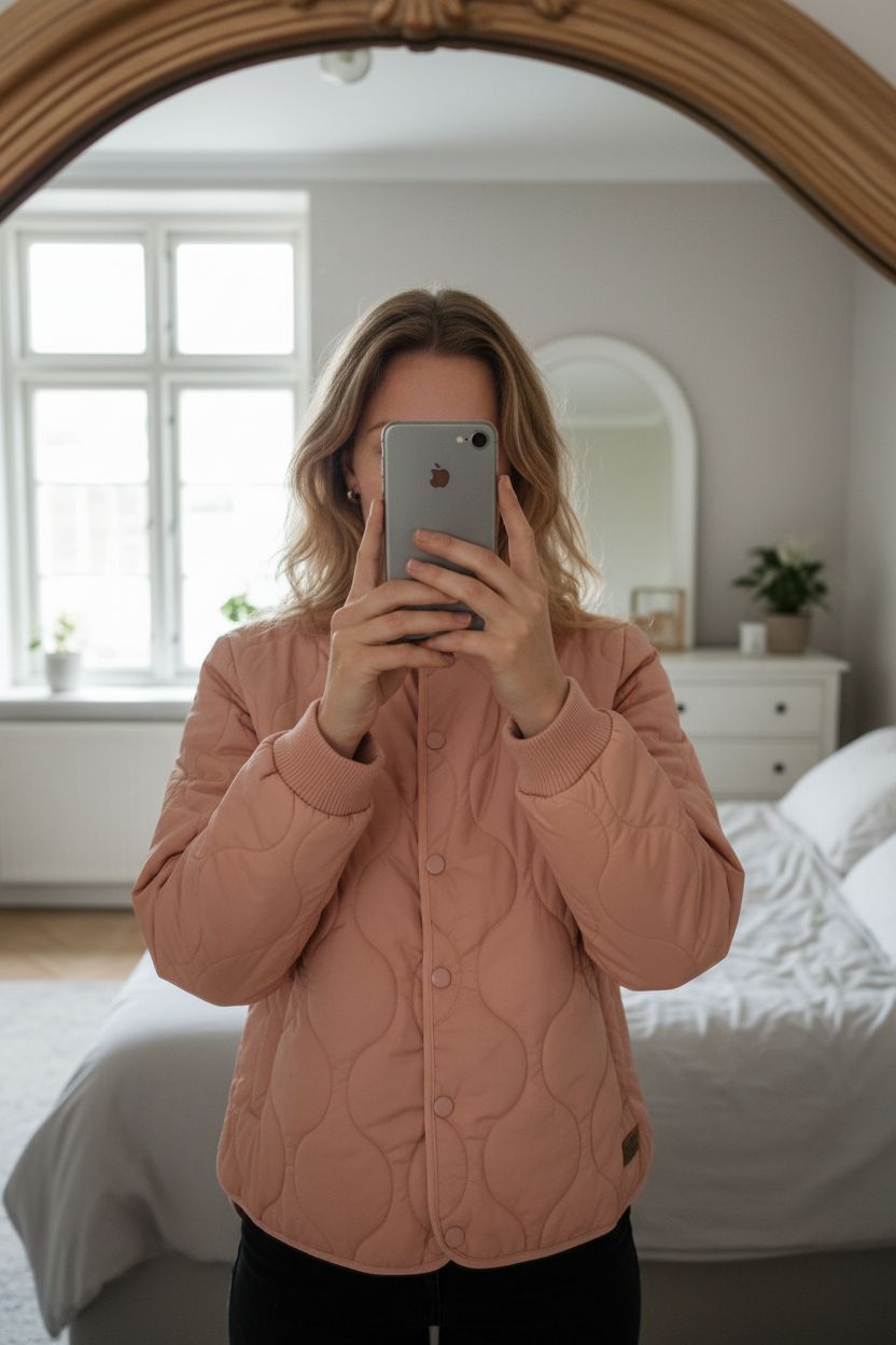 Doudoune légère/blouson debout, face à la caméra, dans une chambre à la lumière douce, avec une lumière naturelle filtrant par la fenêtre.