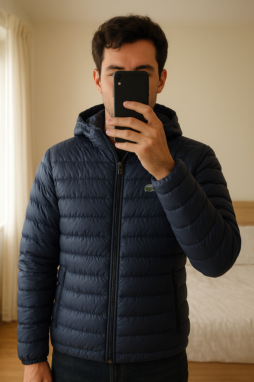 Doudoune Lacoste debout, face à la caméra, dans une chambre à la lumière douce, avec une lumière naturelle filtrant par la fenêtre.