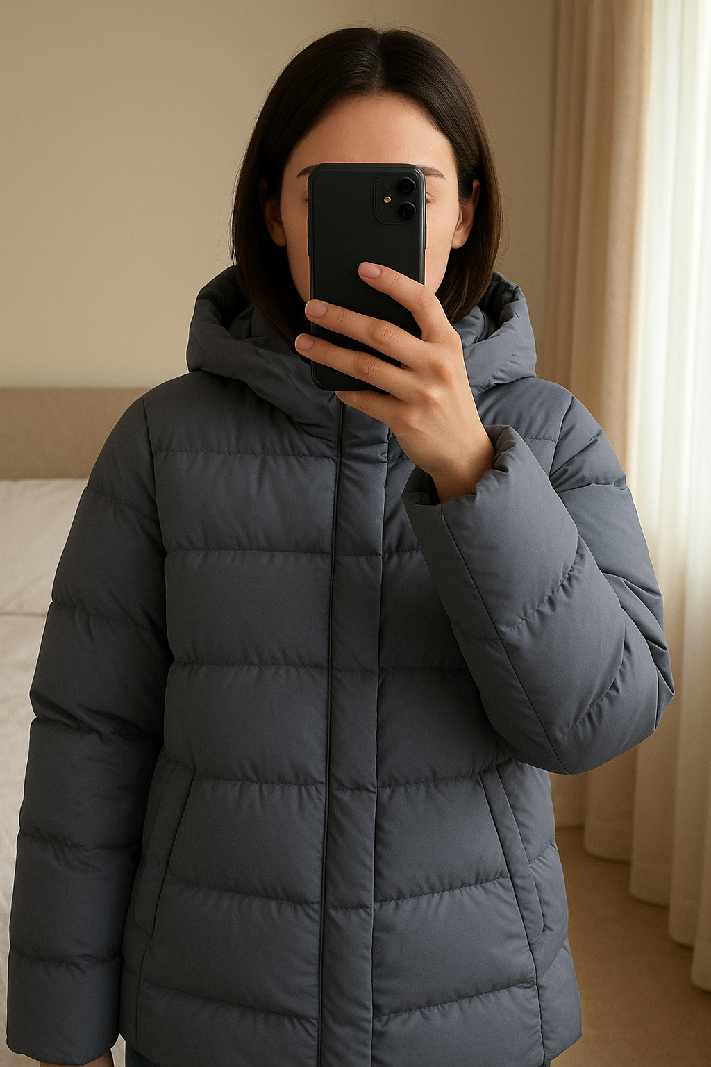 Doudoune mi-longue Uniqlo sans coutures - Femme - Lila/Violet - Taille M debout, face à la caméra, dans une chambre à la lumière douce, avec une lumière naturelle filtrant par la fenêtre.