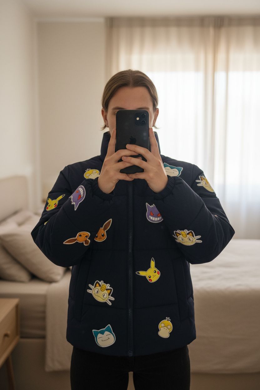 Doudoune Pokémon neuve jamais porté taille M debout, face à la caméra, dans une chambre à la lumière douce, avec une lumière naturelle filtrant par la fenêtre.