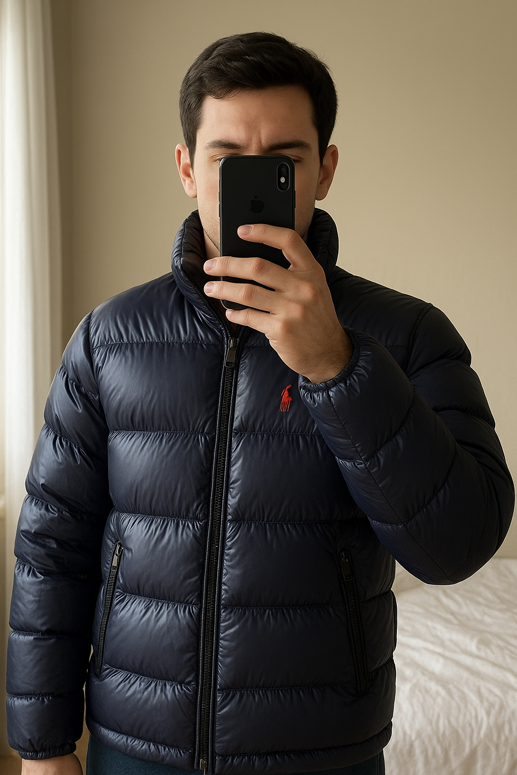 Doudoune Ralph Lauren - Blue Marine - Taille XL debout, face à la caméra, dans une chambre à la lumière douce, avec une lumière naturelle filtrant par la fenêtre.