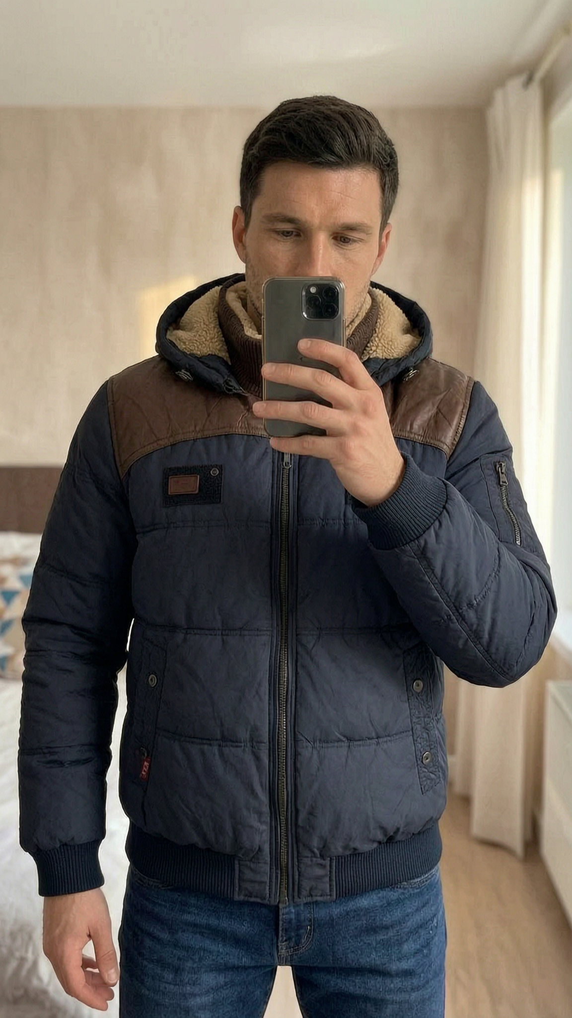 Une personne en Doudoune Redskins bleu marine capuche doublée mouton style aviateur taille XXL debout, face à la caméra, dans une chambre à la lumière douce, avec une lumière naturelle filtrant par la fenêtre.