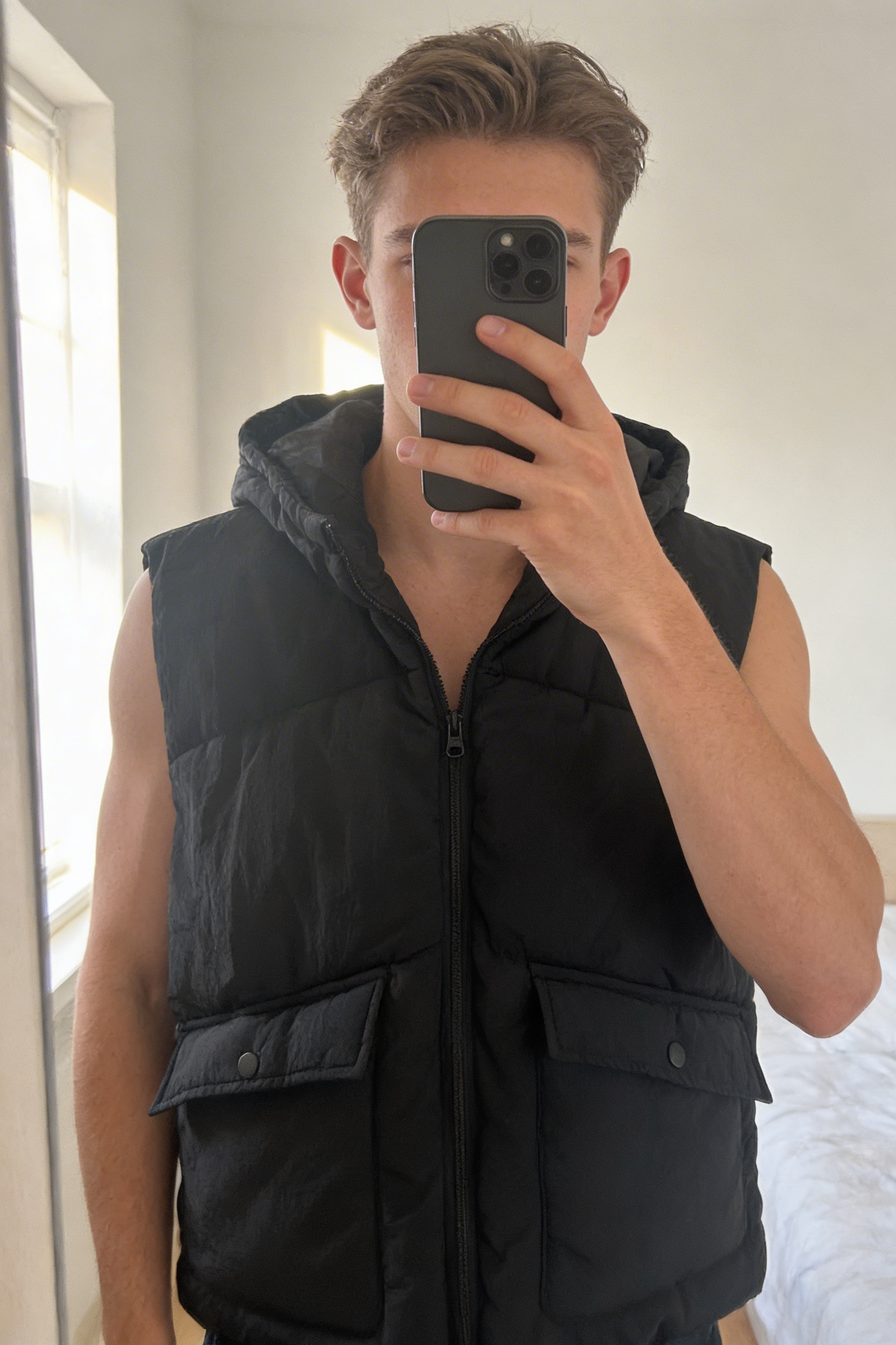 Doudoune sans manche debout, face à la caméra, dans une chambre à la lumière douce, avec une lumière naturelle filtrant par la fenêtre.
