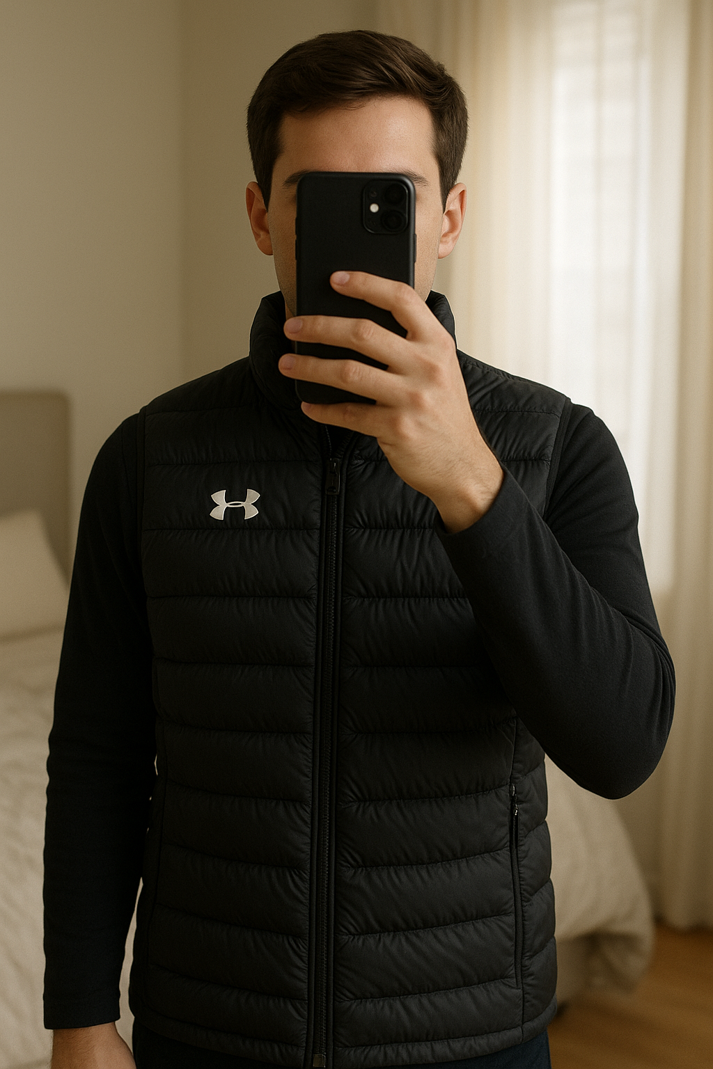 Doudoune sans manche Under Armor debout, face à la caméra, dans une chambre à la lumière douce, avec une lumière naturelle filtrant par la fenêtre.