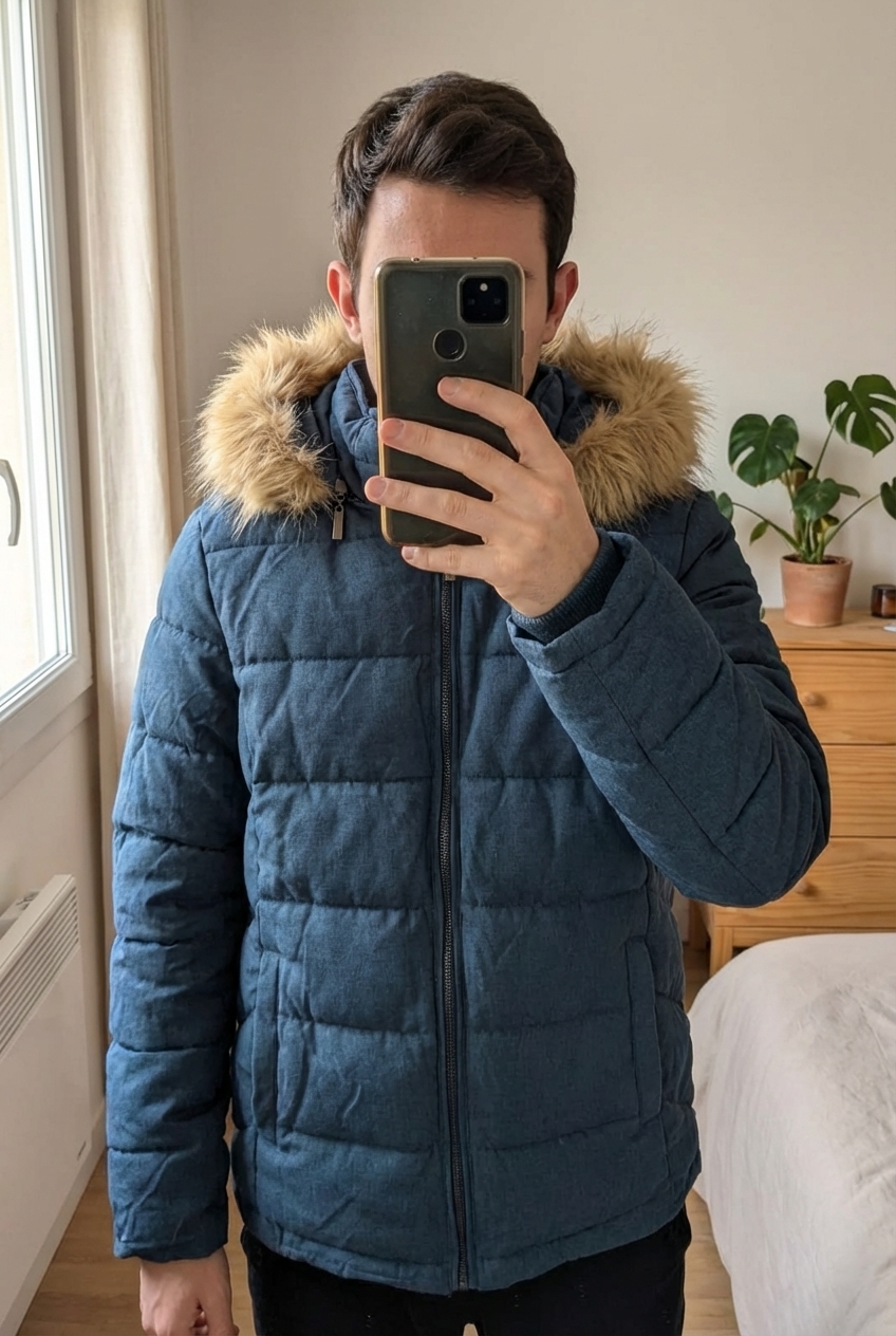 Doudoune sinéquanone neuve debout, face à la caméra, dans une chambre à la lumière douce, avec une lumière naturelle filtrant par la fenêtre.