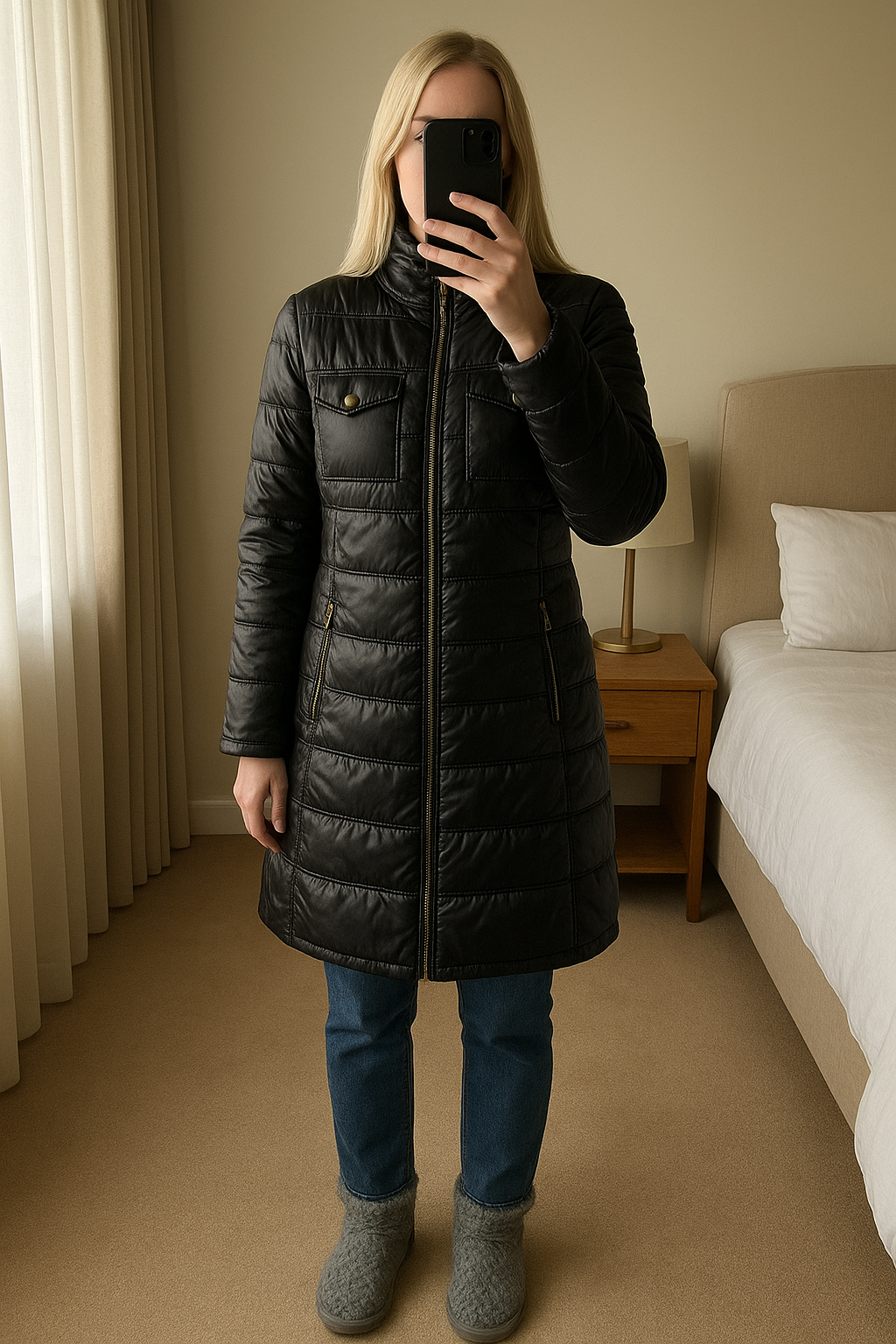 Doudoune Sonia Rykiel debout, face à la caméra, dans une chambre à la lumière douce, avec une lumière naturelle filtrant par la fenêtre.