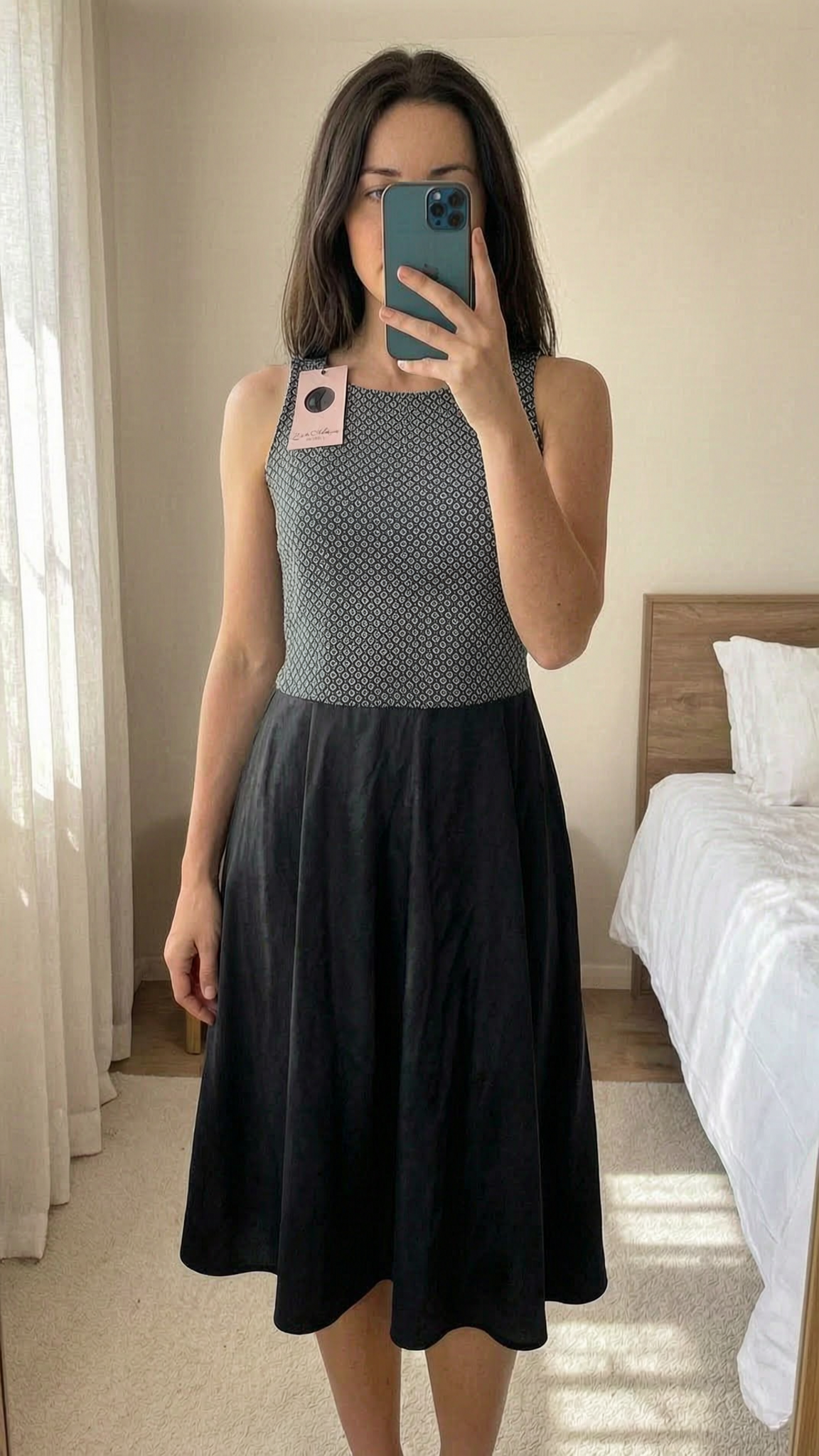 Dress Luna Allegra brand new with tags size m tags standing straight facing the camera, in a softly lit bedroom setting, with gentle natural light filtering through a window.