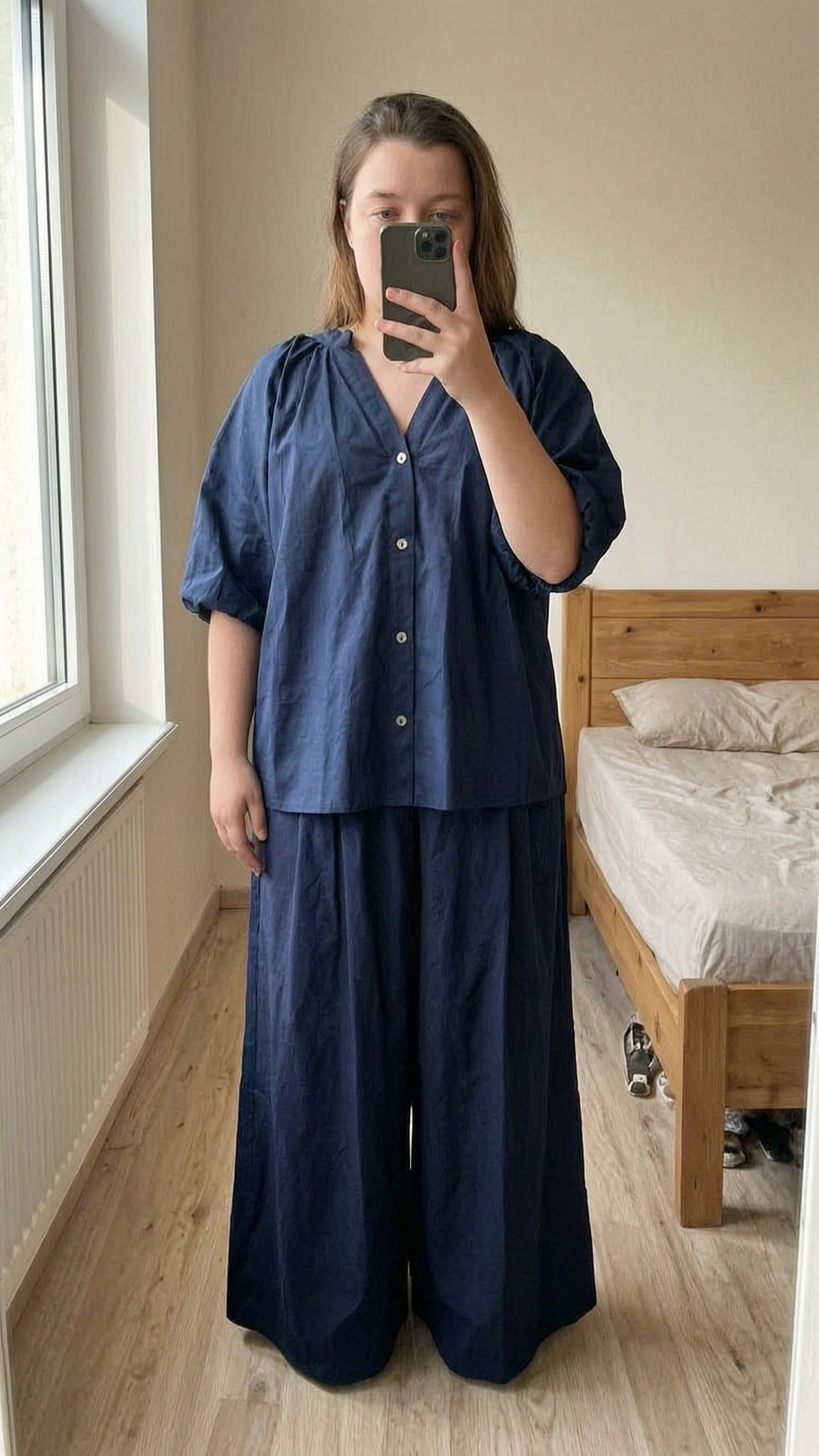 Ensemble de créateur debout, face à la caméra, dans une chambre à la lumière douce, avec une lumière naturelle filtrant par la fenêtre.