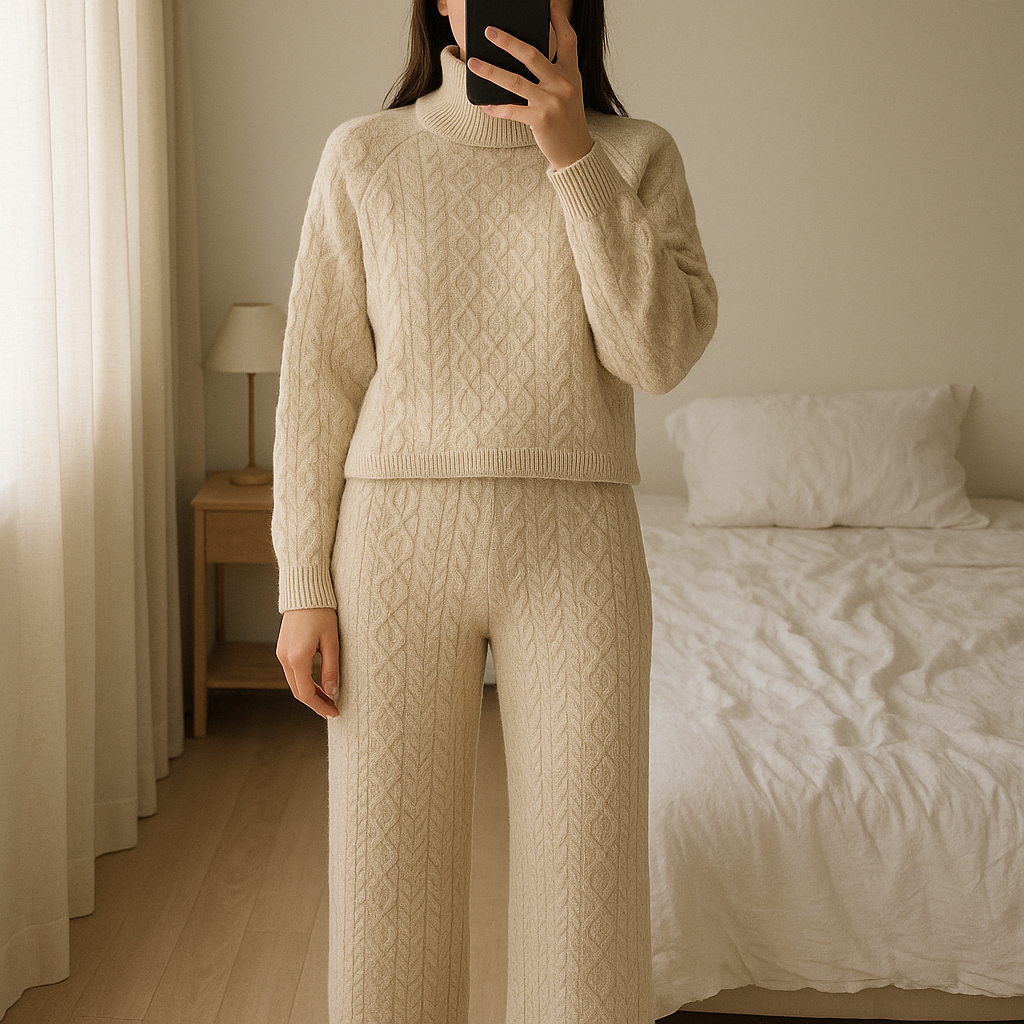Ensemble Esprit 7% Alpaga - Pull + Pantalon Wide Leg - Torsadé - Beige Sable - T36/38 - Parfait État debout, face à la caméra, dans une chambre à la lumière douce, avec une lumière naturelle filtrant par la fenêtre.