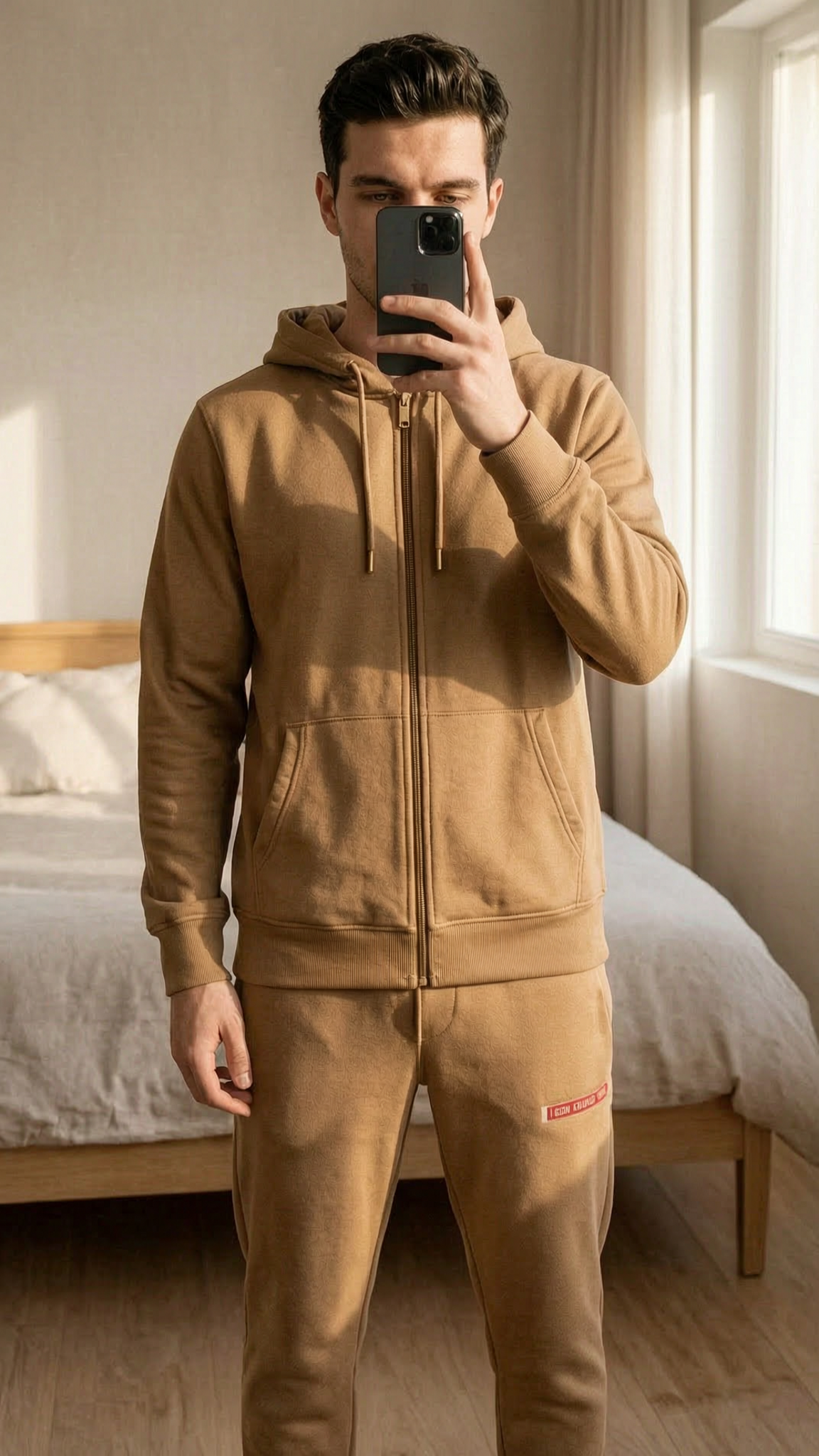 Ensemble jogging veste debout, face à la caméra, dans une chambre à la lumière douce, avec une lumière naturelle filtrant par la fenêtre.