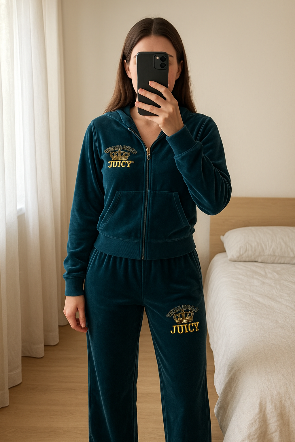Ensemble Juicy Couture - Taille L - Vert émeraude satiné debout, face à la caméra, dans une chambre à la lumière douce, avec une lumière naturelle filtrant par la fenêtre.