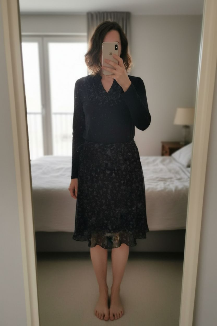 Ensemble T-shirt et jupe Burton debout, face à la caméra, dans une chambre à la lumière douce, avec une lumière naturelle filtrant par la fenêtre.
