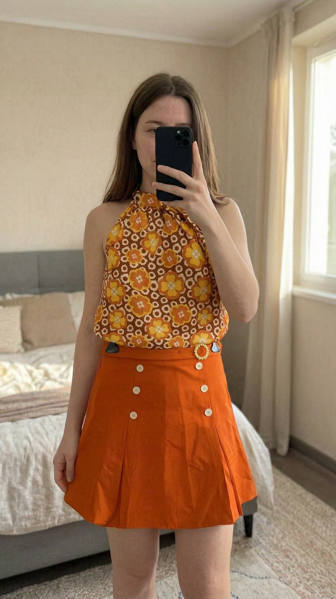Enssemble hippies femme debout, face à la caméra, dans une chambre à la lumière douce, avec une lumière naturelle filtrant par la fenêtre.