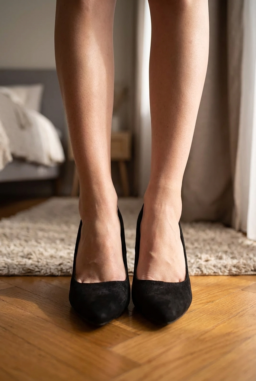 Escarpins Noire debout, face à la caméra, dans une chambre à la lumière douce, avec une lumière naturelle filtrant par la fenêtre.