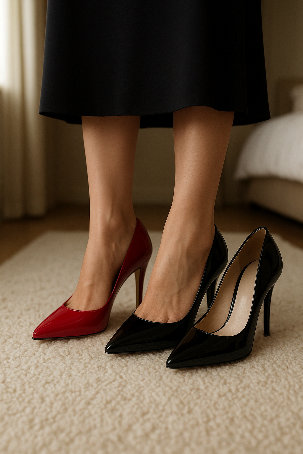Escarpins vernis Rouge 👠 + Noir 🖤. Taille 38 Neufs debout, face à la caméra, dans une chambre à la lumière douce, avec une lumière naturelle filtrant par la fenêtre.