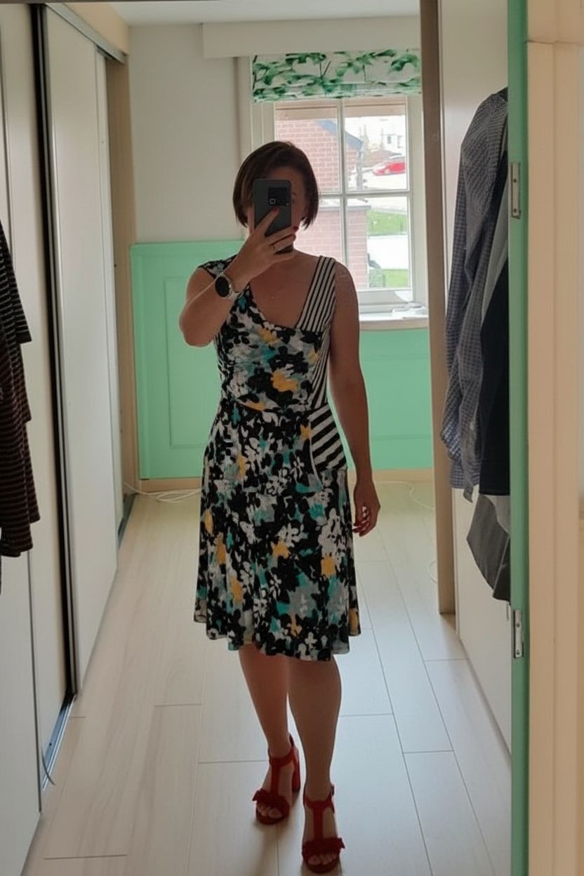 Floral sleeveless dress Marella debout, face à la caméra, dans une chambre à la lumière douce, avec une lumière naturelle filtrant par la fenêtre.