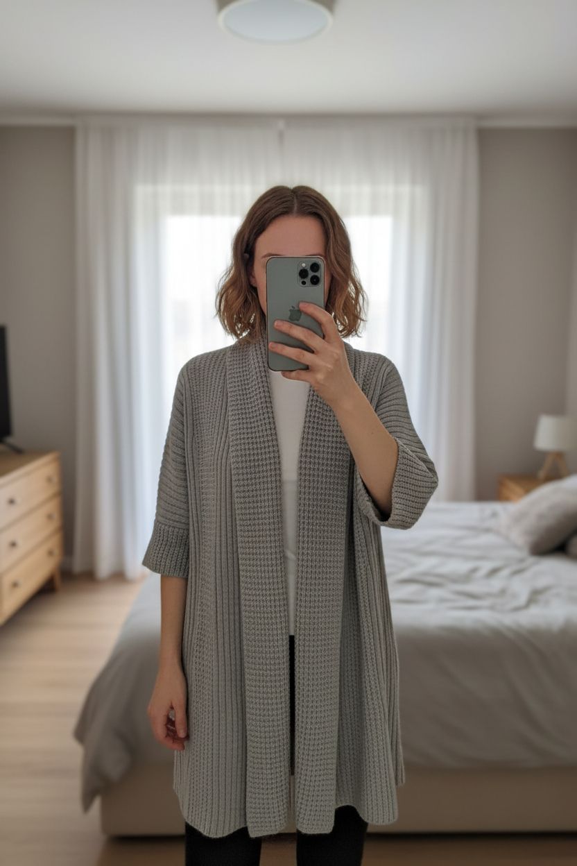 Gilet 38/40 debout, face à la caméra, dans une chambre à la lumière douce, avec une lumière naturelle filtrant par la fenêtre.