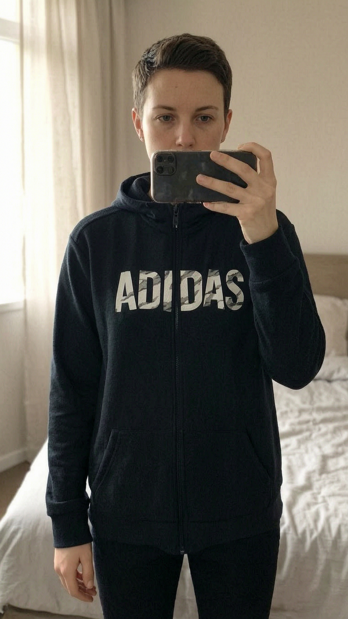 Gilet Adidas debout, face à la caméra, dans une chambre à la lumière douce, avec une lumière naturelle filtrant par la fenêtre.