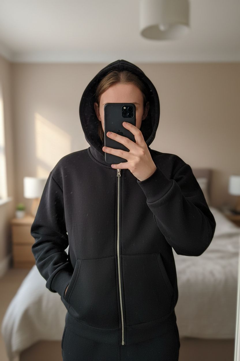 Gilet Asos debout, face à la caméra, dans une chambre à la lumière douce, avec une lumière naturelle filtrant par la fenêtre.