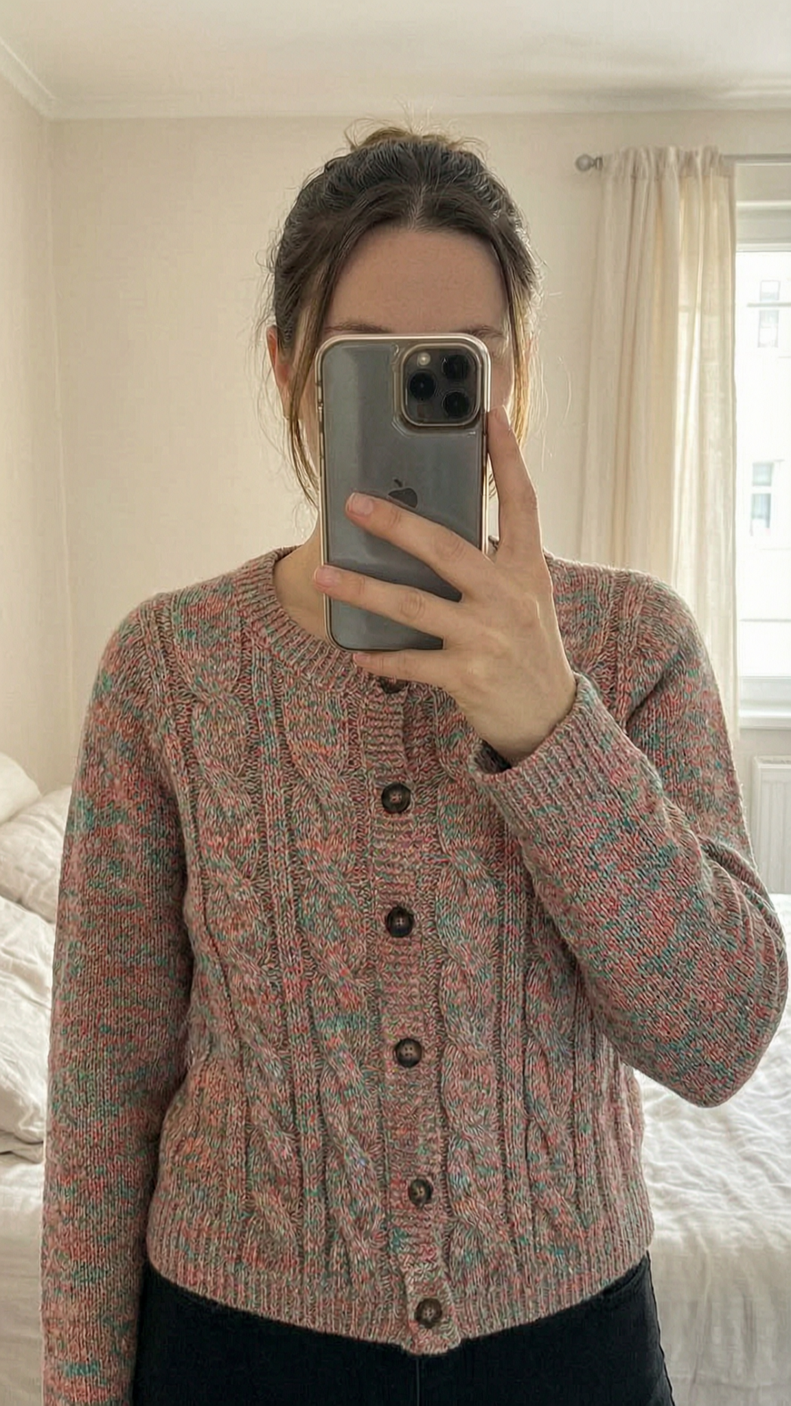Gilet cardigan multicolore en coton taille 40 debout, face à la caméra, dans une chambre à la lumière douce, avec une lumière naturelle filtrant par la fenêtre.
