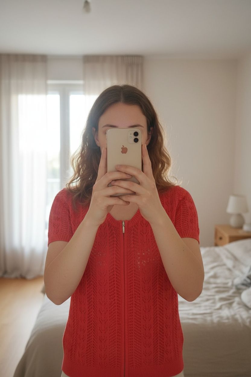 Gilet été cardigan crochet ajouré taille 40 Froggy debout, face à la caméra, dans une chambre à la lumière douce, avec une lumière naturelle filtrant par la fenêtre.