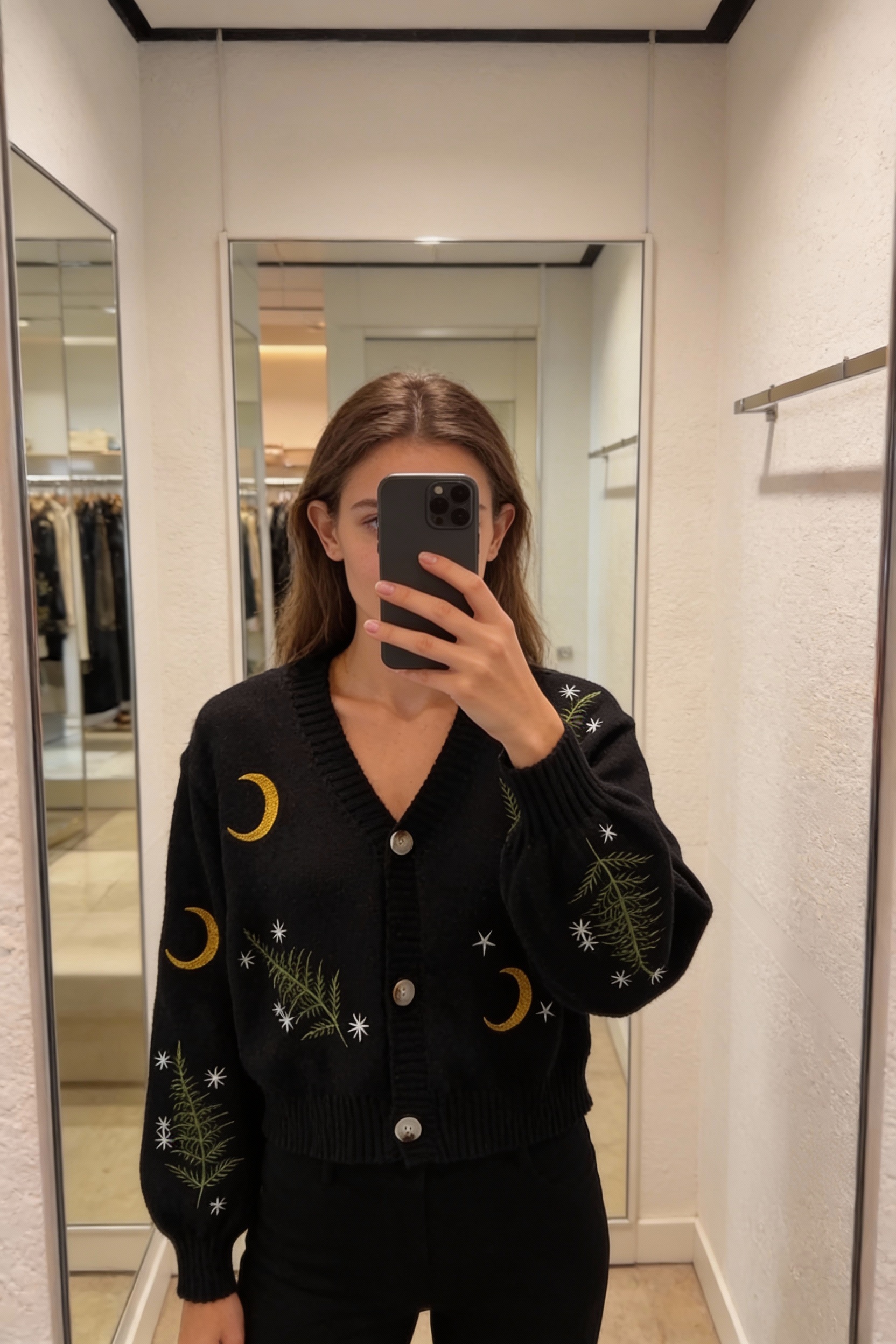 Une personne en Gilet tricoté debout, face à la caméra, dans une cabine d’essayage de style boutique avec un miroir et une décoration neutre.
