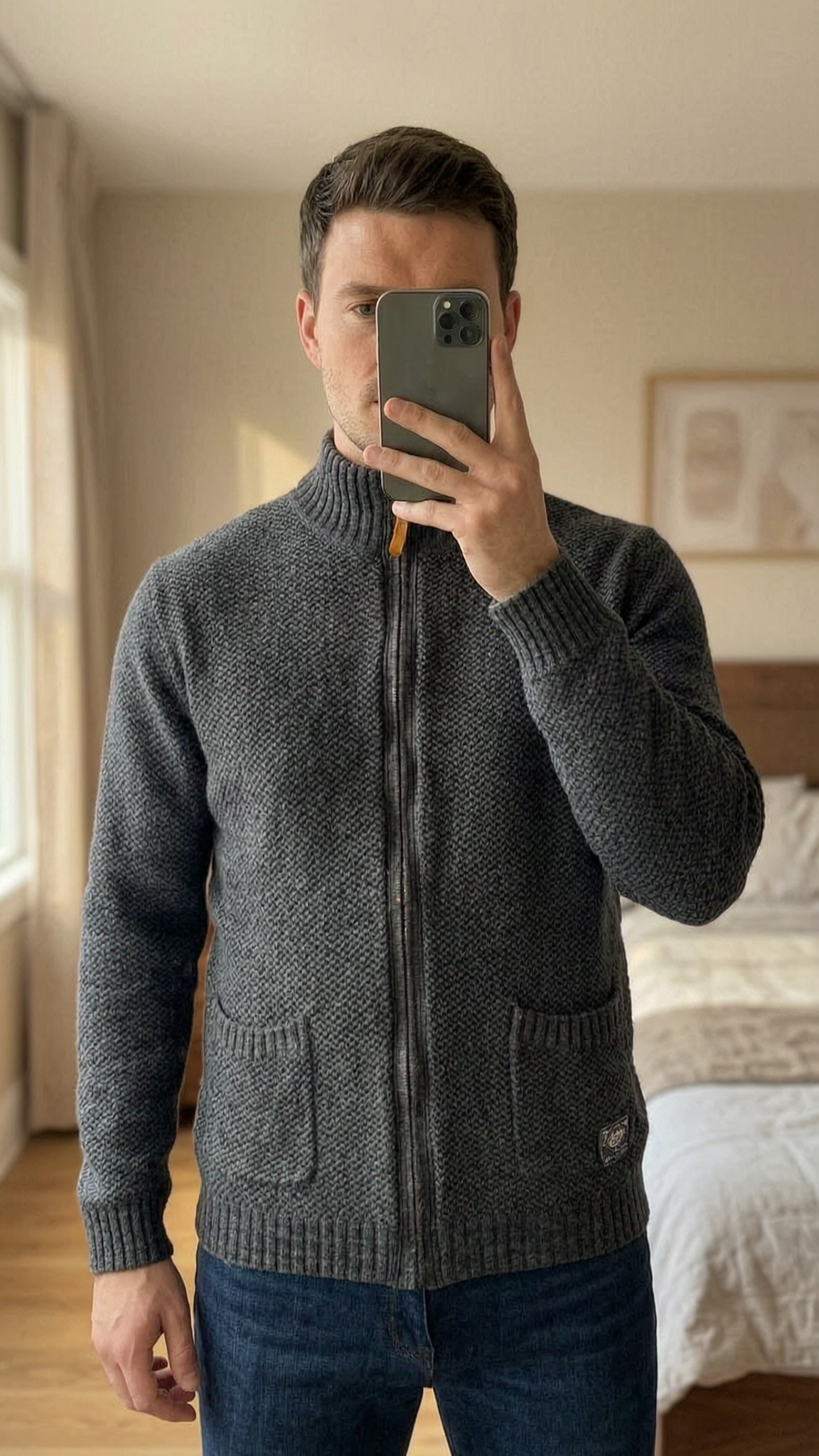 Une personne en Gilet zippé Tommy Hilfiger gris maille texturée - Très bon état - Taille L debout, face à la caméra, dans une chambre à la lumière douce, avec une lumière naturelle filtrant par la fenêtre.