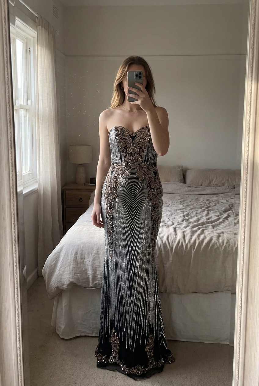 Goddiva Strapless Embellished Maxi Evening Dress – Black & Silver standing straight facing the camera, in a softly lit bedroom setting, with gentle natural light filtering through a window.