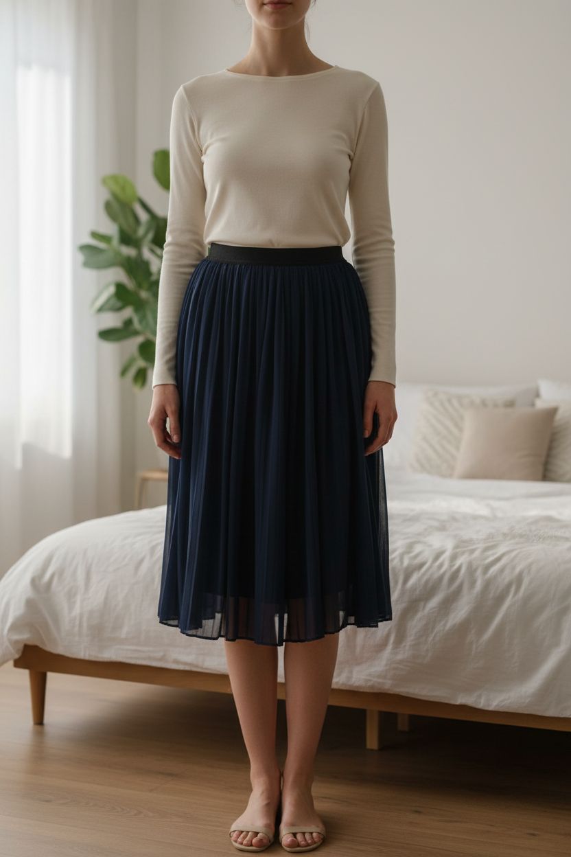 Gonna plissé Zara debout, face à la caméra, dans une chambre à la lumière douce, avec une lumière naturelle filtrant par la fenêtre.