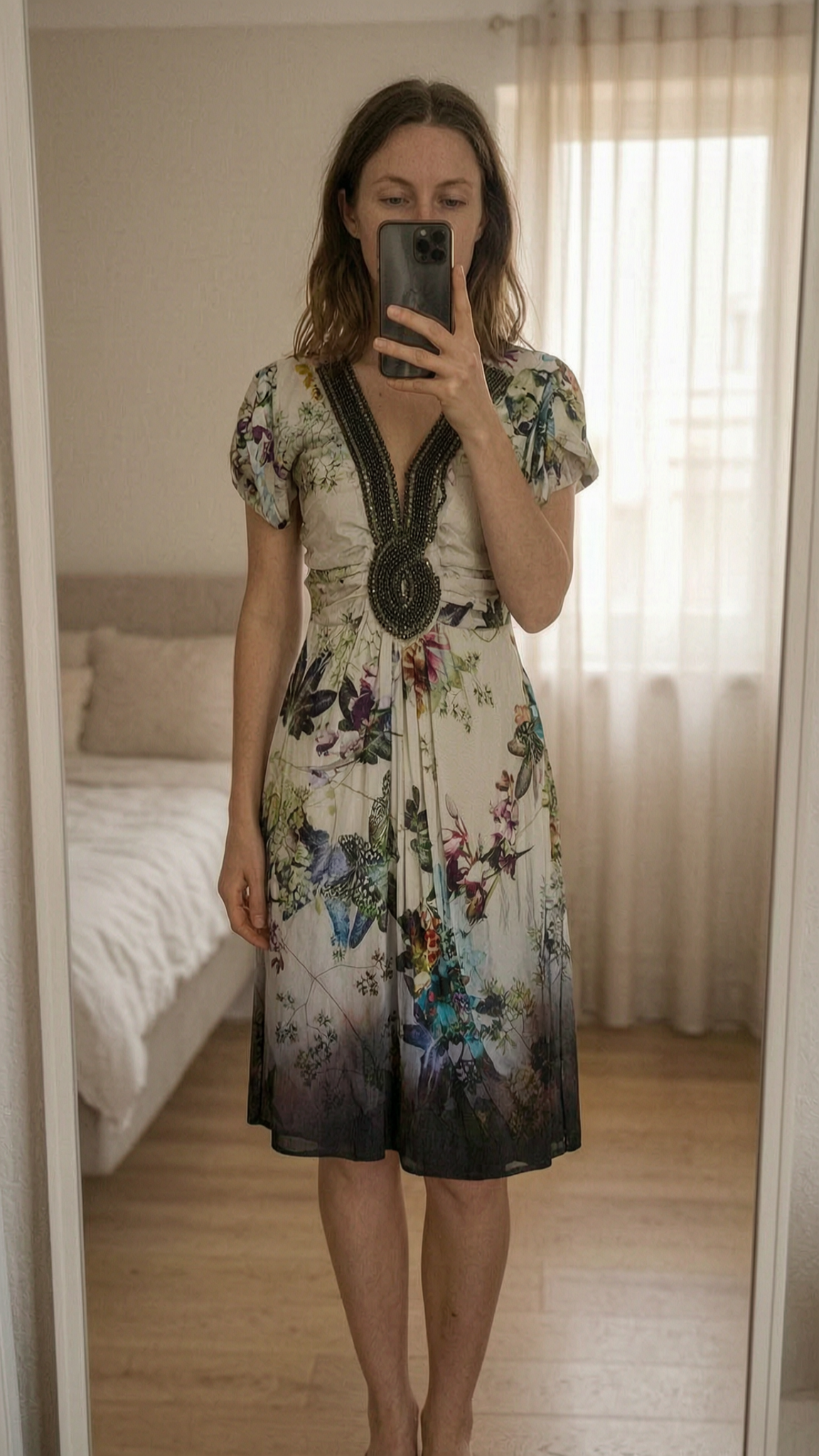 Gorgeous summer dress Ana Alcazar size 36 debout, face à la caméra, dans une chambre à la lumière douce, avec une lumière naturelle filtrant par la fenêtre.