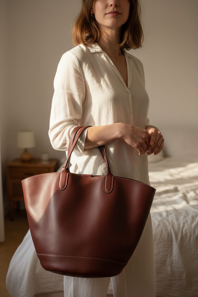 Grand sac à main mango en cuir en V debout, face à la caméra, dans une chambre à la lumière douce, avec une lumière naturelle filtrant par la fenêtre.