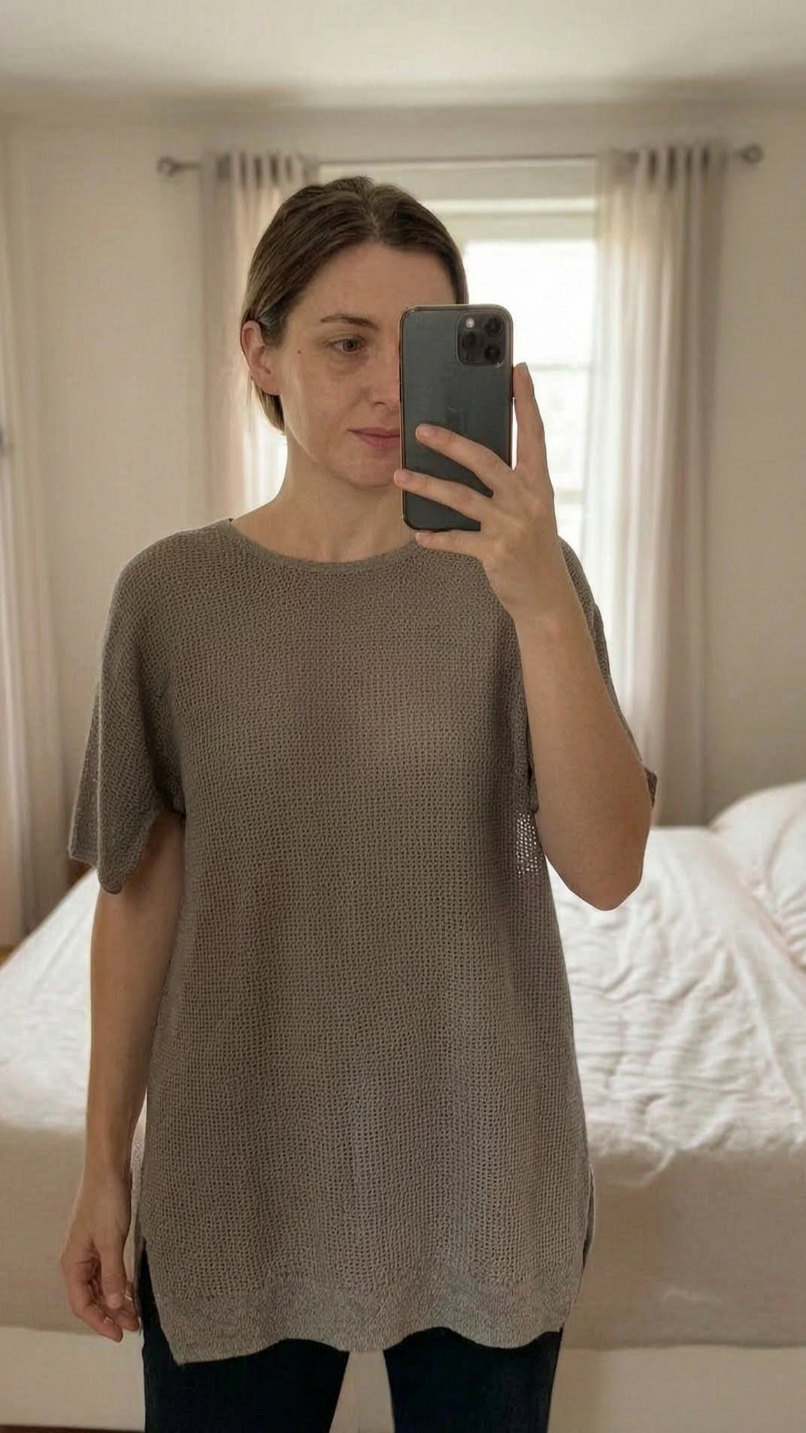 Haut en mailles Caroll debout, face à la caméra, dans une chambre à la lumière douce, avec une lumière naturelle filtrant par la fenêtre.