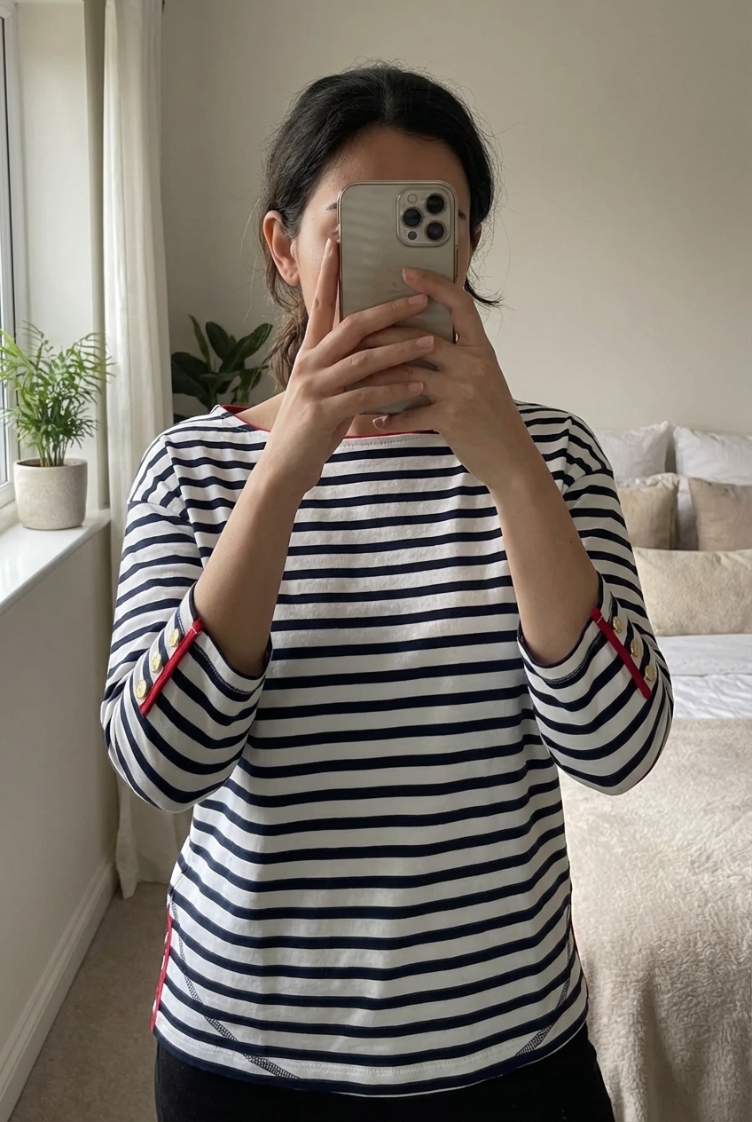 Haut marin Zara TS debout, face à la caméra, dans une chambre à la lumière douce, avec une lumière naturelle filtrant par la fenêtre.