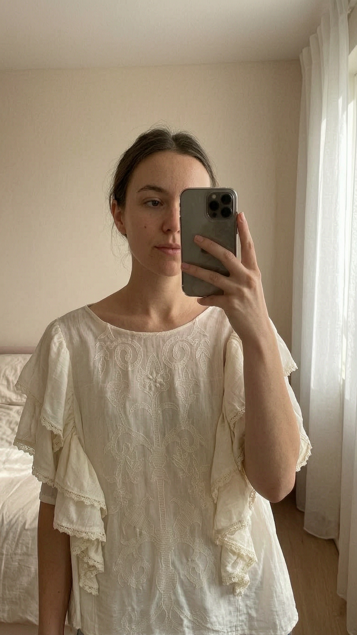 Haut Promod debout, face à la caméra, dans une chambre à la lumière douce, avec une lumière naturelle filtrant par la fenêtre.